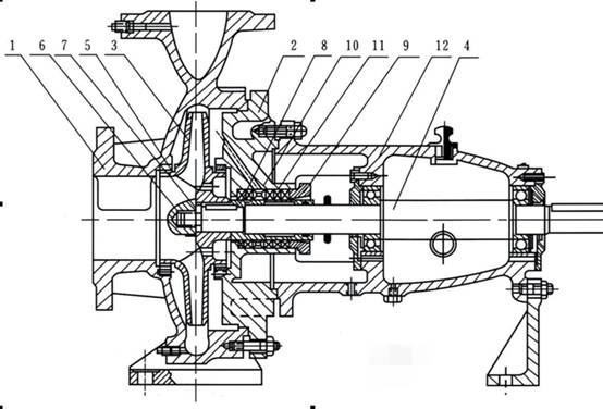 1 泵體 2 泵蓋 3 葉輪 4 軸 5 密封環(huán) 6 葉輪螺母 7 止動墊圈 8 軸套 9 填料壓蓋 10 填料環(huán) 11 填料 12 懸架軸承部件