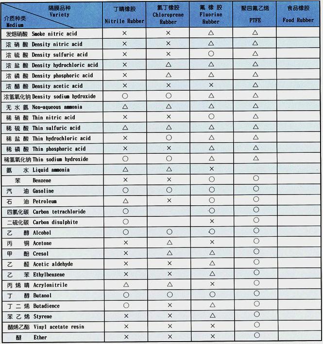 注:○——表示壽命較長;△——表示壽命一般;×——表示不可用。本表僅從耐腐性考慮,因聚四氟乙烯彈性比橡膠差,所以實際使用壽命因壓力,隔膜泵、行程、雜質等因素影響而異。食品橡膠專用于食品飲料行業(yè)。