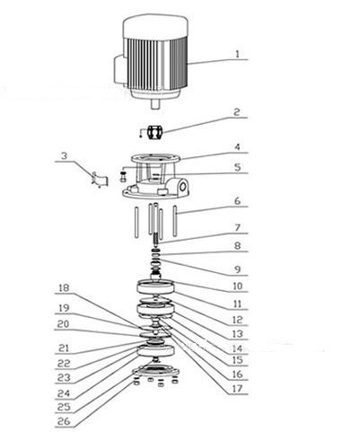1、三相異步電動(dòng)機(jī) 2、聯(lián)軸器 3、防護(hù)罩 4、進(jìn)出水段